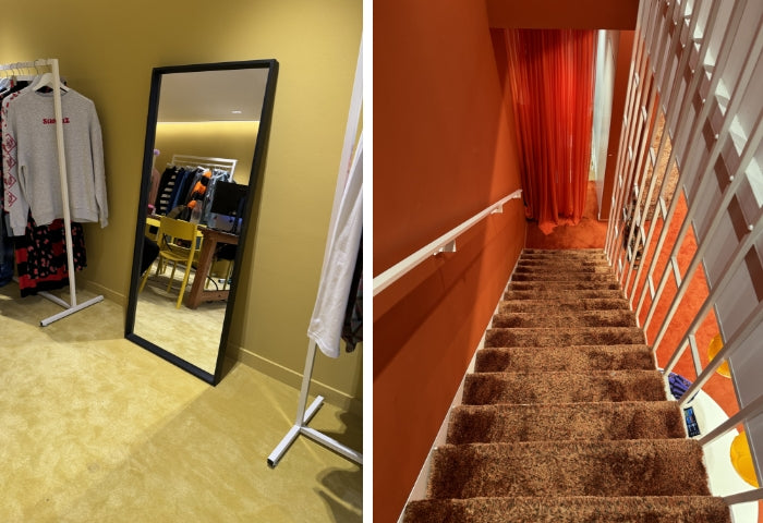 De Stieglitz-winkel in de 9 straatjes in Amsterdam is een uitgesproken beleving waarin tapijt de hoofdrol speelt. Van muren en plafonds tot trappen en kasten: alles is bekleed met zacht, hoogpolig tapijt. Het out-of-the-box interieur met seventies vibes trok wereldwijd aandacht en onderstreept de unieke signatuur van het modemerk.